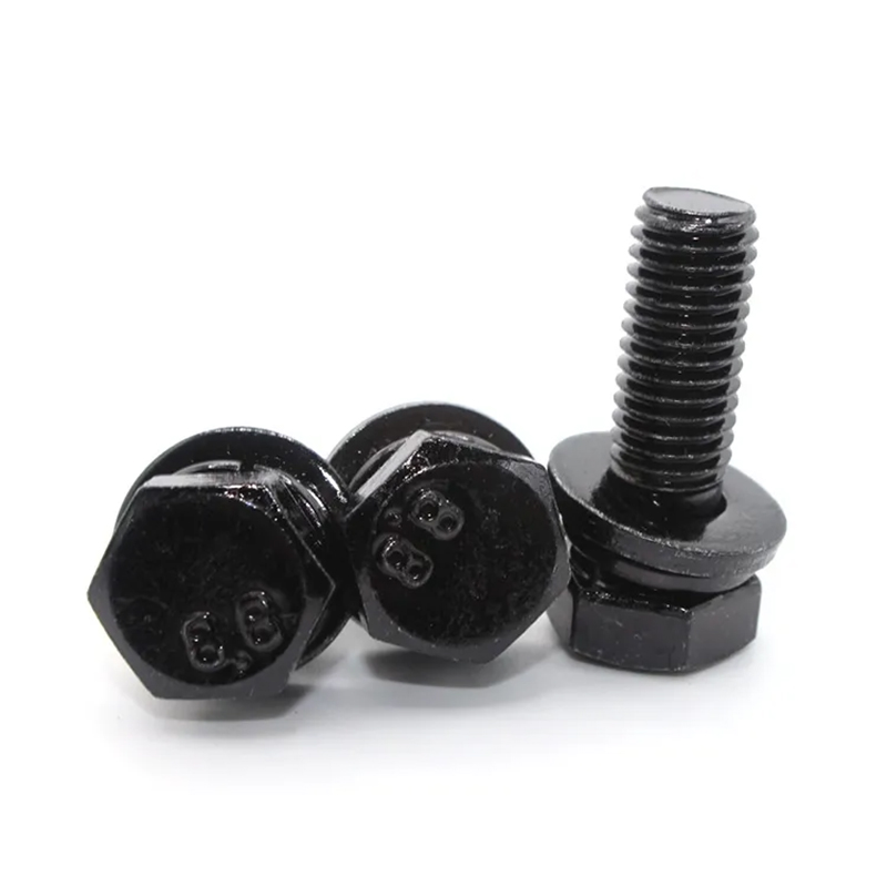 Høy styrke:Svart oksyd sekskant bolt med fjærvaskemaskinLaget av 8,8 grad av legering av legering med utmerket strekkfasthet og skjærmotstand, egnet for en rekke høye belastningstilkoblingsscenarier.