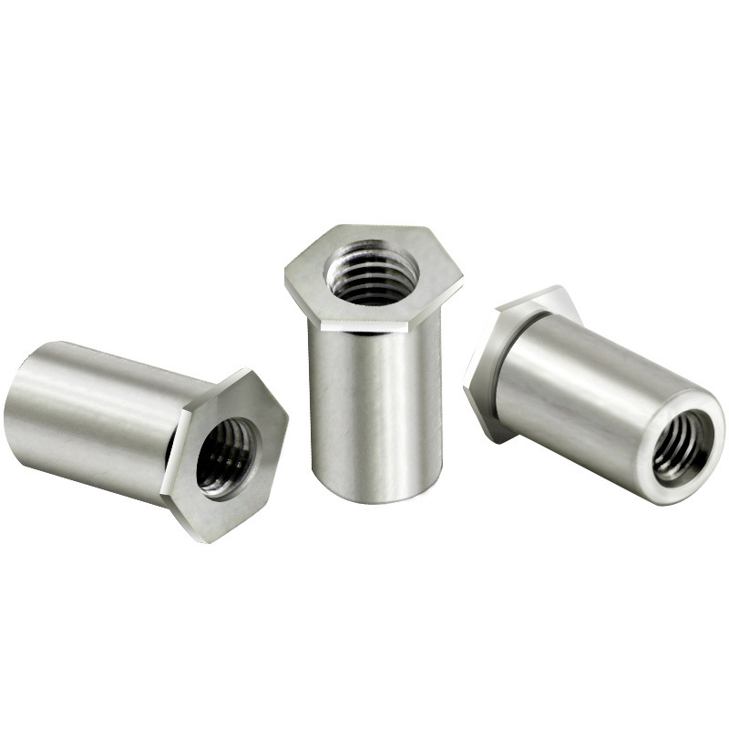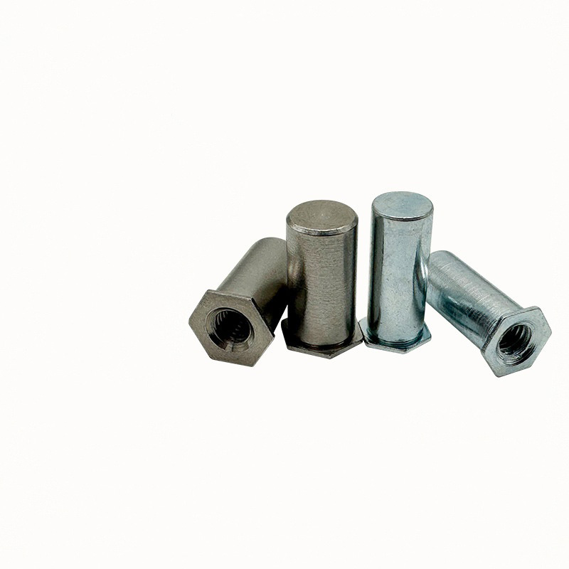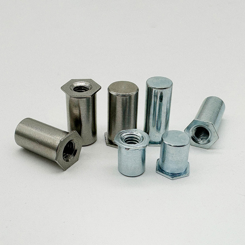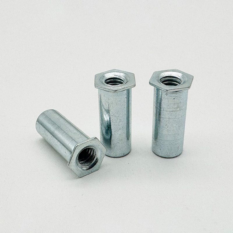 Karbonstål sekskantet nageltnøttesøyle er et spesialisert feste med indre tråder. Den er laget for å lage tøffe, bærende tråder i tynne eller sprø materialer der du ikke kan bruke sveising. Det fungerer som et permanent anker, og har en sekskantet kropp som hindrer den i å spinne under installasjonen. Den hule søylen kollapser utover når du bruker et nagleverktøy, og danner en solid bule på den blinde siden.