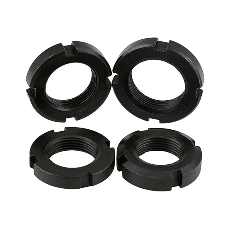 Denne dobbeltsikrede, slissede låsemutteren er en avgjørende komponent i bilmontering - spesielt for å feste hjulaksellagre og akselsystemet, er det å kunne motstå vibrasjoner nøkkelen. Den har en sirkulær design med flenser på innsiden, og innvendige låsekomponenter og radielle spor, som kan feste seg fast i den angitte posisjonen.