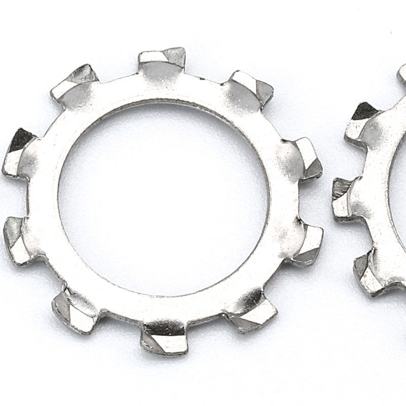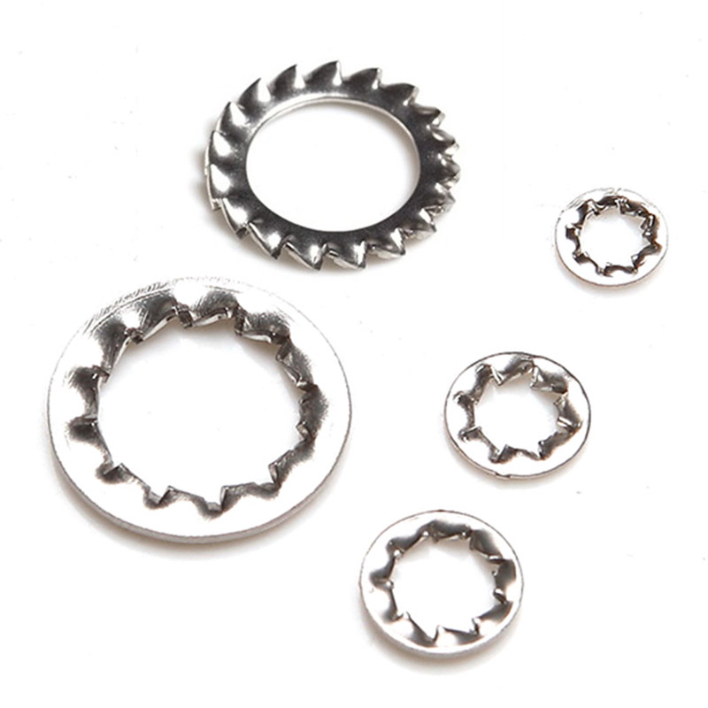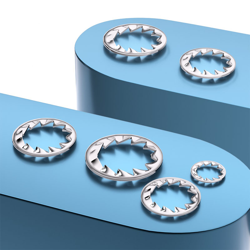 Eksterne tenner låserer laget av karbonstål eller rustfritt stål, noe som gjør dem tøffe og motstandsdyktige mot rust. Noen typer er varmebehandlet for å bli hardere (rundt HRC 40-50), så tennene griper bedre. Rustfritt stålversjoner (som SS 304 eller 316) fungerer godt i våte eller kjemiske miljøer, mens sinkbelagte har ekstra beskyttelse mot rust. Materialet har en fjærende kvalitet, slik at vaskemaskinen kan bøye seg litt under press, men likevel holde jevn spenning. De er stemplet med presisjon for å sikre at alle tennene er i samme form og størrelse, så hver batch fungerer det samme. Disse skivene er både tøff og fleksibel, og er bra for både tunge maskiner og presise utstyrsoppsett.