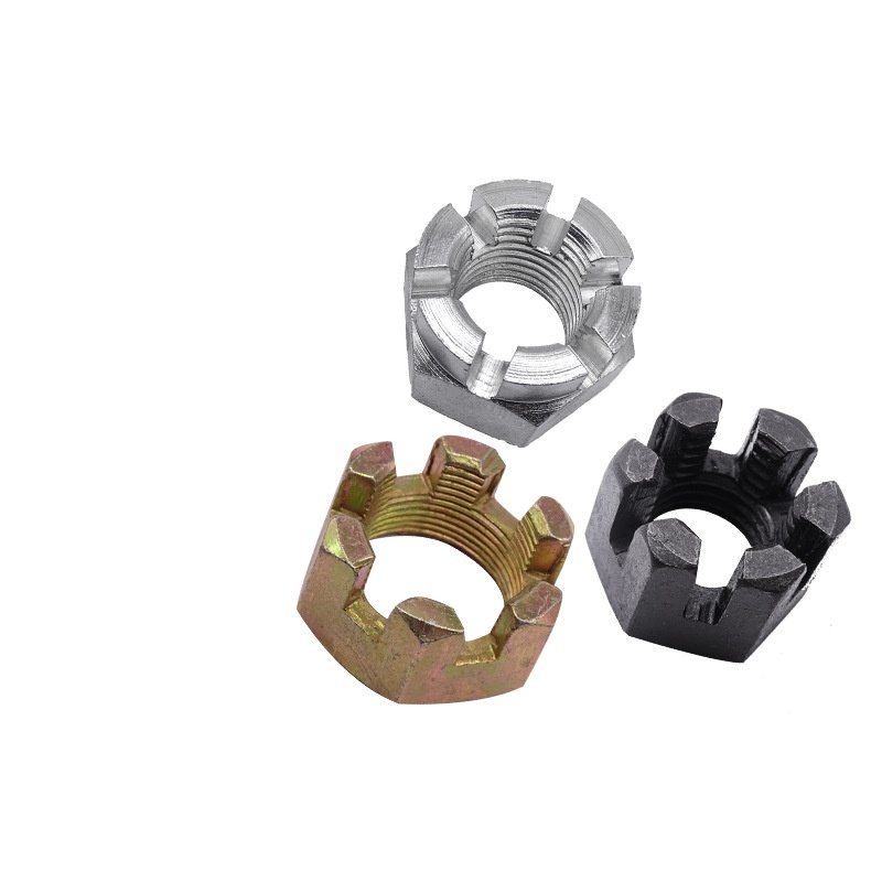 Det viktigste med høy momentkronemutter med spalte er at de kan låse på plass på egen hånd. Slik fungerer det: Når du strammet mutteren til høyre dreiemoment på en bolt eller pigg som har et tvers av hull, stiller du opp sporet i mutterens krone med det hullet. Så stikker du en kotternål eller sikkerhetstråd gjennom både sporet og hullet. Denne tingen kan forhindre at mutteren blir vendt tilbake - hvis du vender den tilbake, vil mutteren løsne; Og avhengig av hvordan du kobler ledningene, kan det til og med hindre at mutteren blir vendt for hardt for å forhindre at den blir overstrammet. På den måten forblir forbindelsen satt selv med vibrasjoner og kan ikke bli rotet med lett - noe som virkelig er viktig for kritiske oppsett.