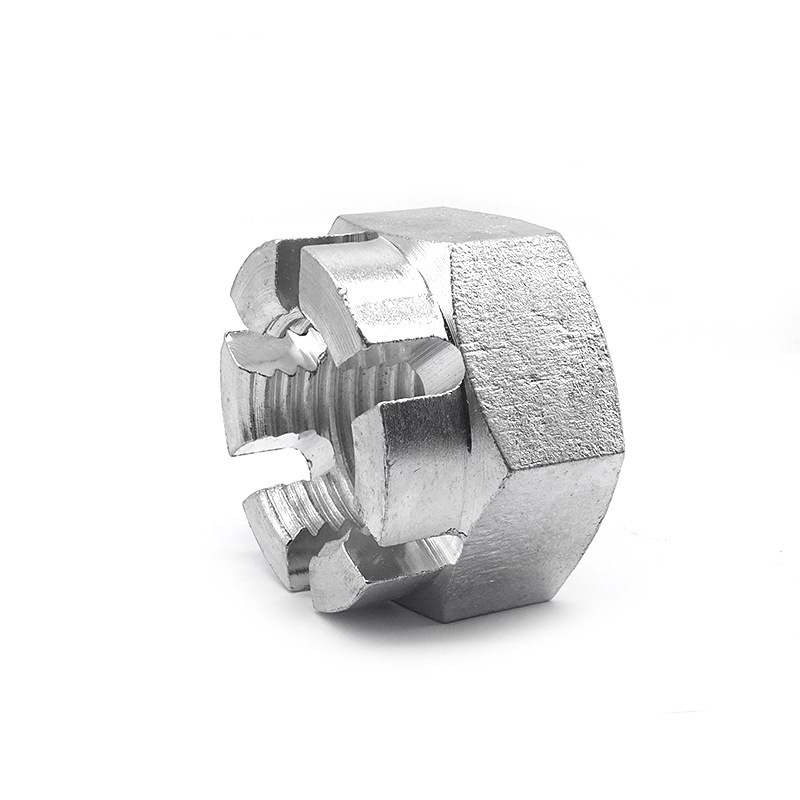 Den høye momentkronemutteren med spalte er et spesielt feste som brukes i viktige jobber der du trenger å sørge for at den holder seg låst på plass, selv med vibrasjoner eller hvis den prøver å vri seg. Det ser ut som en vanlig sekskantmutter, men på toppen er det en sylindrisk kronedel med et spor kuttet i den. Det sporet lar deg låse den tett ved hjelp av en kotternål eller sikkerhetstråd. Disse nøttene holder seg når vanlige nøtter kan slippe løs, så de er ganske nødvendige for tøffe mekaniske oppsett - spesielt innen luftfart, bilproduksjon og tunge maskiner, der sikkerheten virkelig betyr noe.