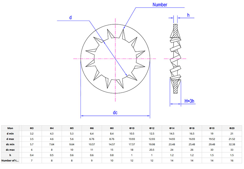 Deinnvendige tenner takket låseskivehar en takket form på innsiden for å øke friksjonen og lette forsterkning. Ved vibrasjoner på grunn av ytre krefter kan den låses bedre. Det finnes en rekke materialer å velge mellom, og du kan velge riktig materiale i henhold til bruksmiljøet og spesifikke behov.