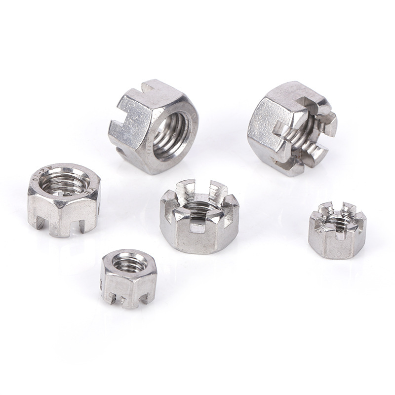 Disse kommer også i brøktommers størrelser som 1/2"-20 eller 5/8"-18. Sekskantstørrelsen følger standard SAE-nøkkelstørrelser, og sporavstanden er festet for å matche splintens diameter, vanligvis 1,5 mm til 3 mm avhengig av mutterstørrelsen.