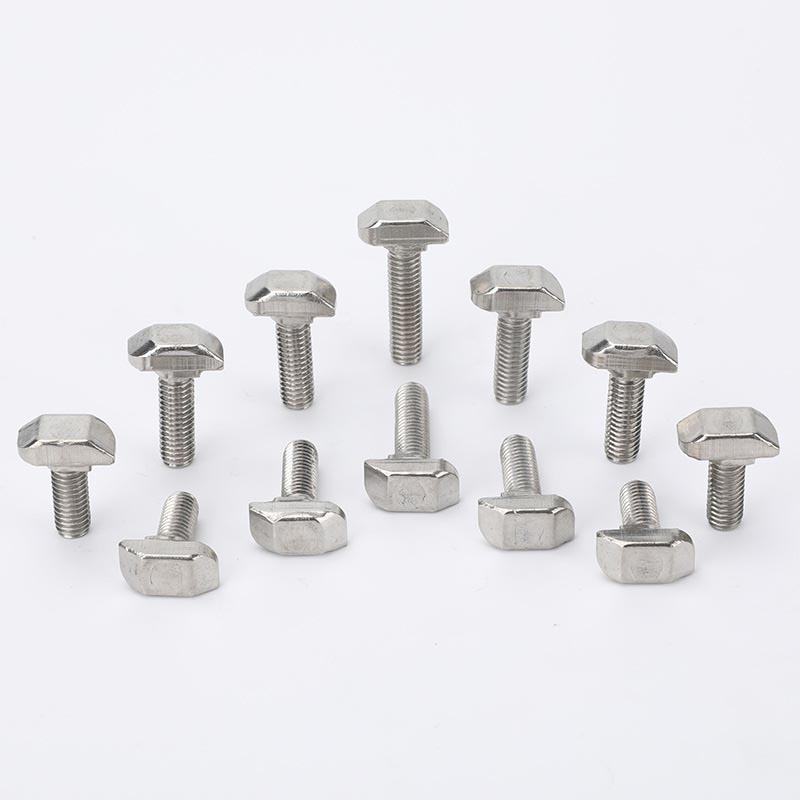 T-formede firkantede nakkebolter kan brukes til å installere transportbåndstasjonsenheter, som glir inn i rammesporene. Når du strammer tannhjulbraketten, låses bolthalsen, og opprettholder dermed presis innretting under spenningsprosessen. Misjusteringen av remskiven forårsaket av rotasjonen av boltene er eliminert.