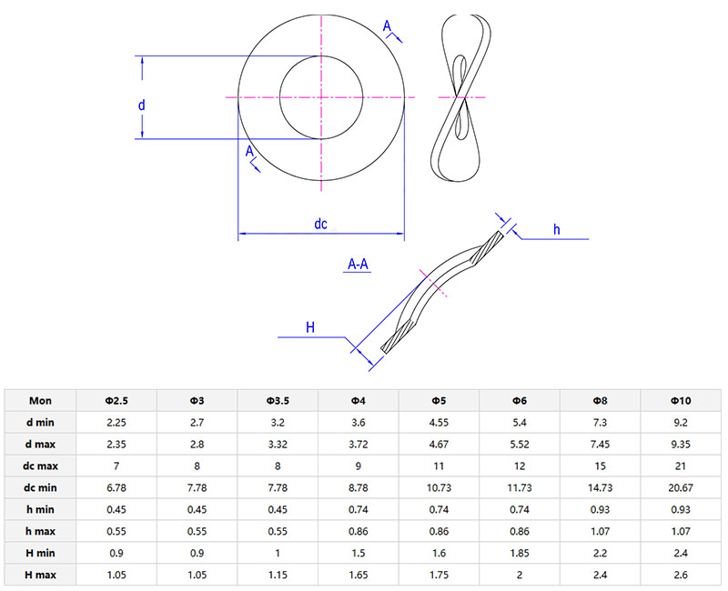 Wave Washer kommer i standardstørrelser (som DIN 6796 eller ISO 10664) eller kan gjøres for å bestille for spesifikke belastningsbehov. Indre diametre går fra 2mm til 100 mm, og tykkelser varierer fra 0,5 mm til 6 mm, avhengig av hva de er brukt til. Tungtyper har større ytre diametre og tykkere seksjoner for å håndtere mer trykk.